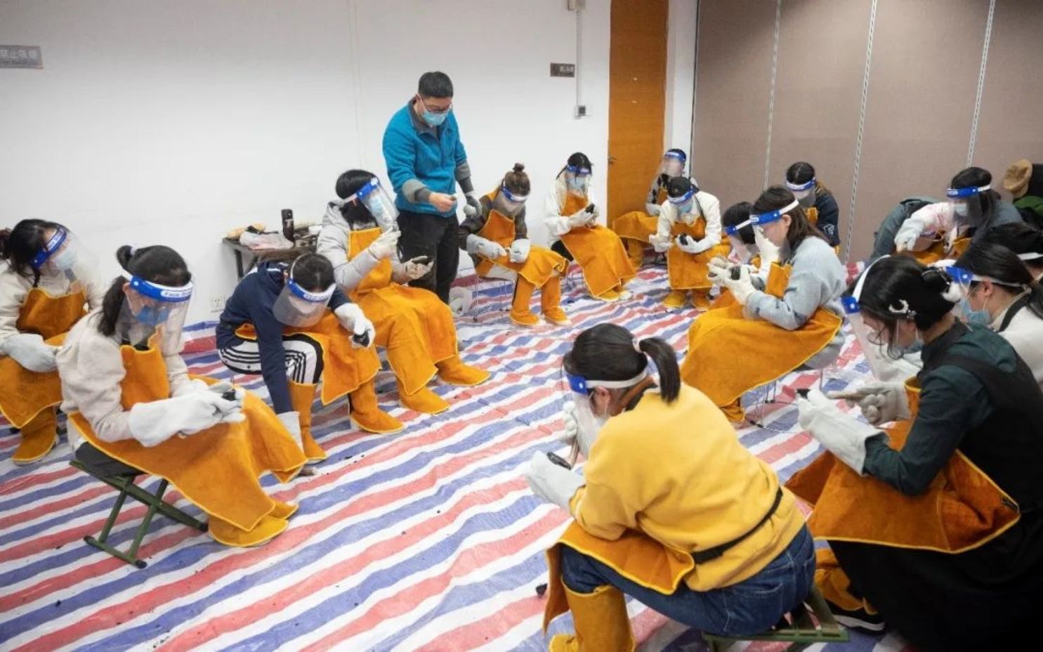 陈老师讲解完,穿戴好防护服的同学们早已摩拳擦掌、跃跃欲试,迫不及待要打制一件精美的石器。