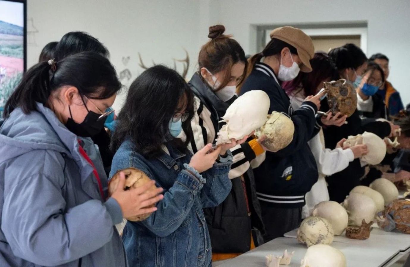 讲座结束后,同学们进入教学模型观摩环节。考古文博系三位青年教师借助古建筑模型、陶器标本、动物骨骼和人类骨骼,分别从建筑考古、人类骨骼考古、动物考古等方面,进一步向同学阐释考古学是如何利用包括人类自身在内的多种物质遗存开展科学研究的。